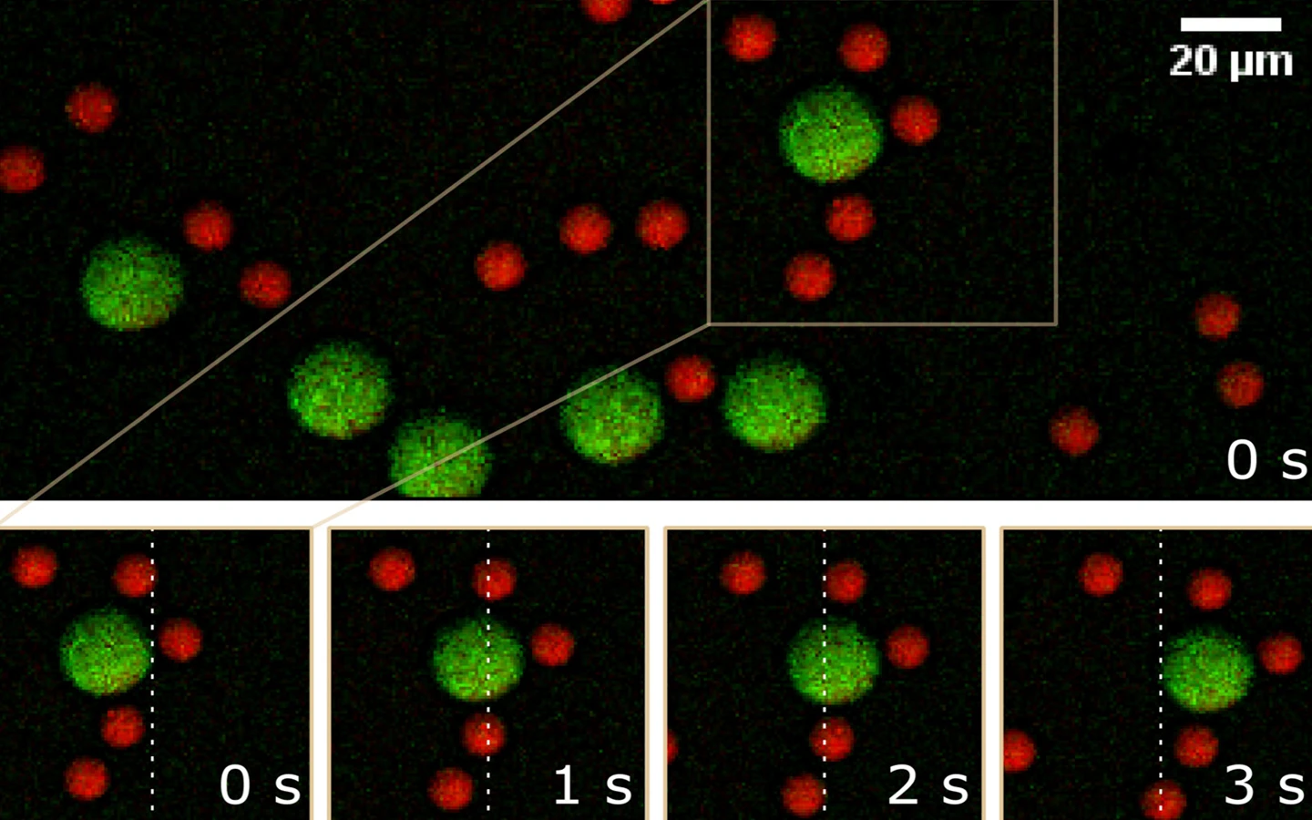 CARS images of flowing PS and PMMA beads, acquired using CRONUS-2P. The bottom images show a time course of a selected area as indicated with 1 s intervals to exemplify the flow. The white dashed line is for motion reference.
