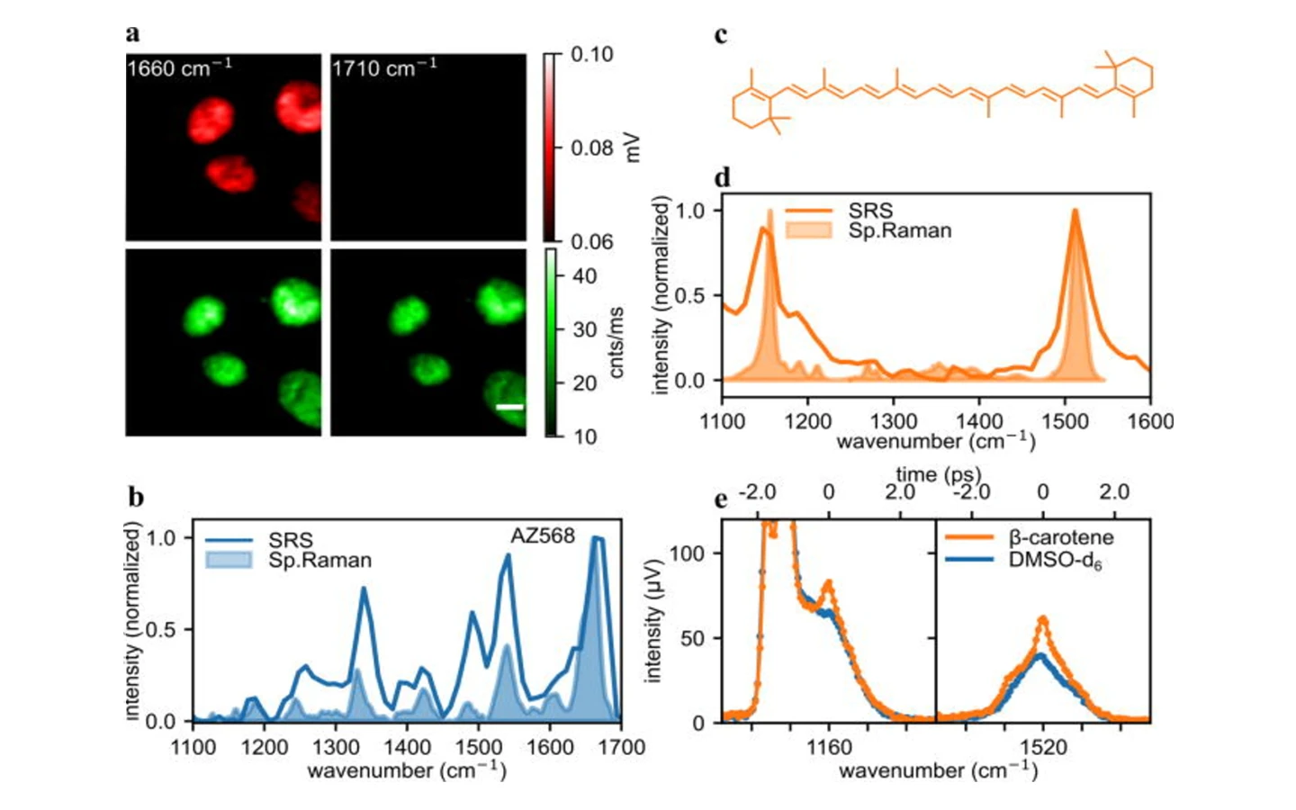 (a) Imaging of nuclei of AZ568 stained, fixed HeLa cells with SRS (red) and fluorescence (green). (b) SRS and spontaneous Raman spectrum (at 488 nm) of 1 mM solution of AZ568 in DMSO-d6. (c) Structure of β-carotene. (d) β-Carotene spectrum recorded with SRS and spontaneous Raman. (e) Spectral focusing spectrum of β-carotene solution in DMSO-d6. The images were recorded using CRONUS-2P.