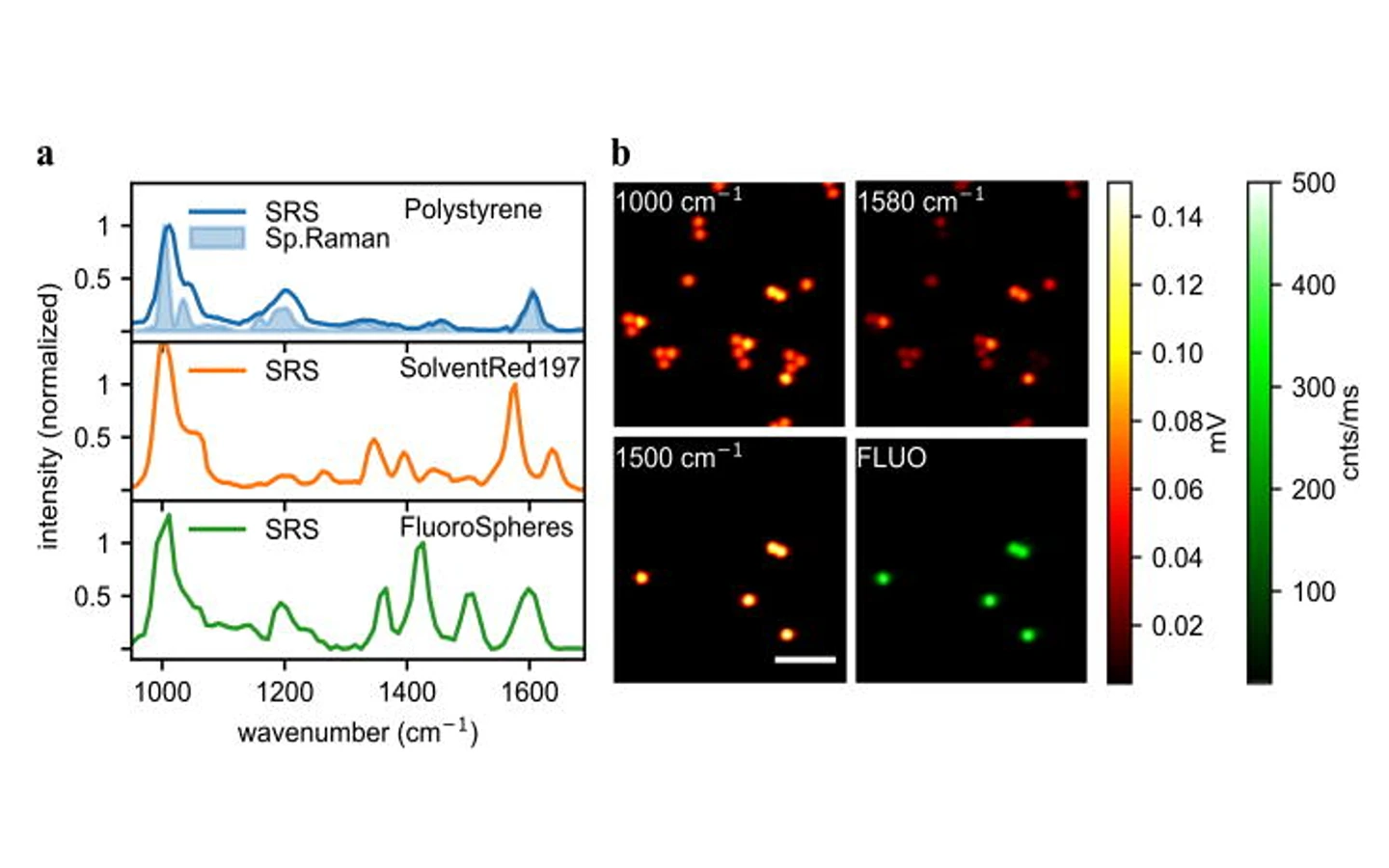(a) Spontaneous Raman and SRS spectra of polymeric materials, normalized with the molecule of interest maximum peak. (b) SRS images of dyed and un-dyed PS beads. Images were recorded using CRONUS-2P.