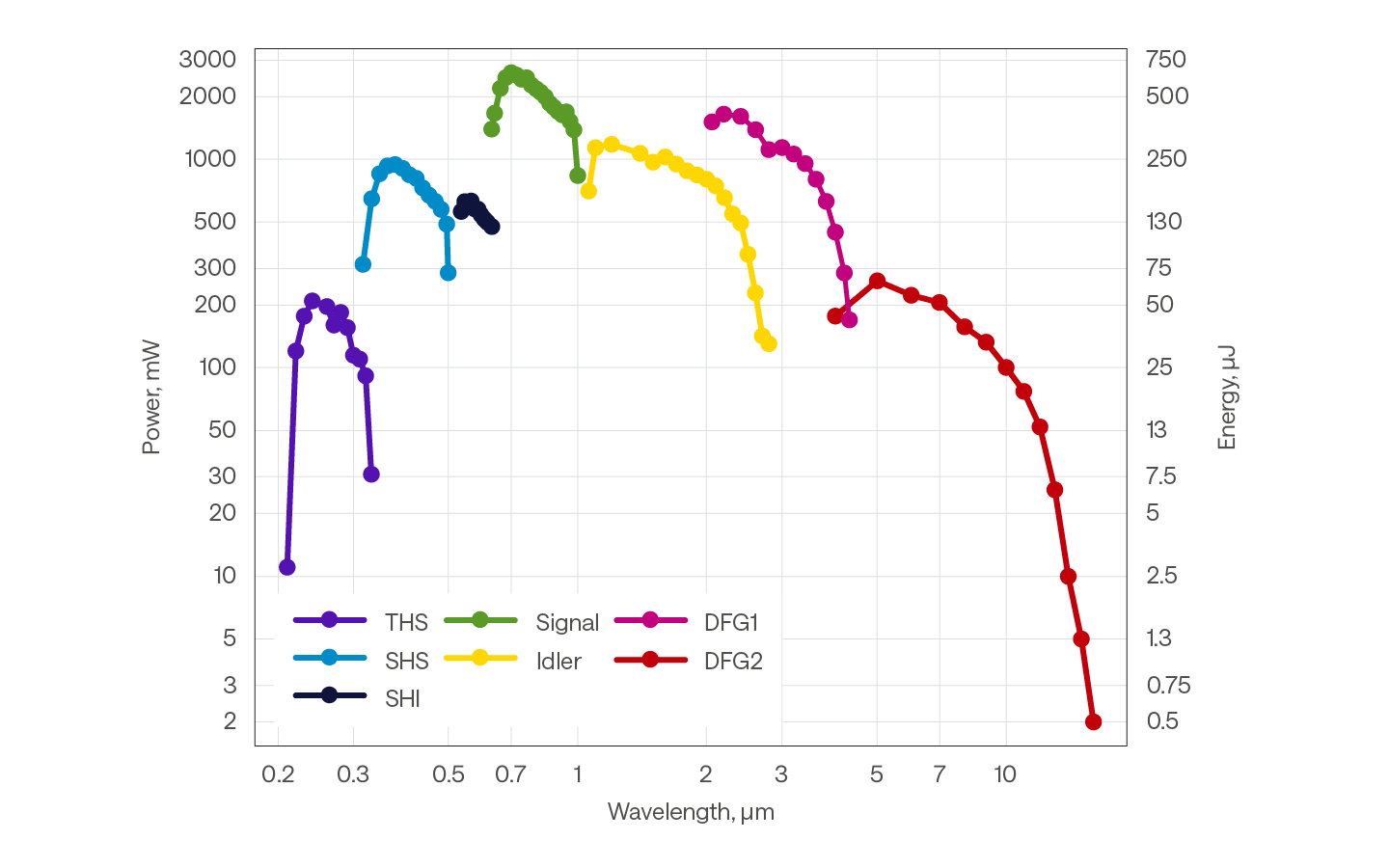 | DFG | 2200 – 4200 nm (DFG1): > 3% @ 3000 nm | 2500 – 4200 nm (DFG1): > 3% @ 3000 nm | 4000 – 16 000 nm: > 0.3 % @ 10 000 nm | 4000 – 16 000 nm: > 0.3 % @ 10 000 nm |